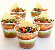 6. Finally, pour the diced veggies (I also like to add in beans to the mix) evenly into each cup. Then, presto! Your amazingly easy-to-make and delicious tray of party snacks has been served.